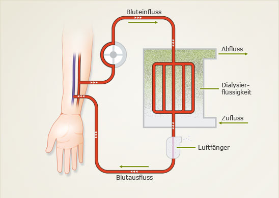 Bei der Hämodialyse (siehe Abbildung) wird das Blut außerhalb des Körpers durch eine Dialysemaschine von harnpflichtigen Substanzen gereinigt und dann zurück in den Körper geleitet.
